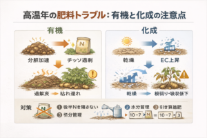 | 高温年で“効きすぎ”が怖い | 有機は控えめ+引き算徹底/化学肥料も濃度注意 | 有機の無機化加速とEC上昇リスクがある |