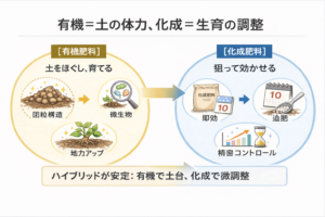 | 地力を上げたい/土が硬い | 有機(堆肥・有機質)+必要分を化成 | 土の物理性・生物性を整えつつ不足を補正 |